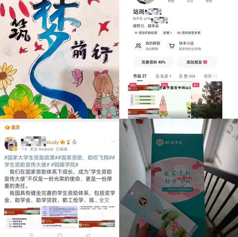 学校还将学生资助宣传大使活动与暑期学生社会实践活动相结合,进一步提升活动时效性。为达到更好地宣传效果,学生资助宣传大使们还通过创作资助宣传画、微视频等作品,通过快手短视频、微博、微信公众号、QQ群等媒介,广泛宣传国家和学校资助政策。通过这个活动平台的锻炼、实践,学生资助宣传大使们的综合能力得到了锻炼和提升,也更加坚定了他们的理想信念,促进个人成长成才,增强了他们的爱党爱国热情,培养了他们的社会责任感和时代使命感。